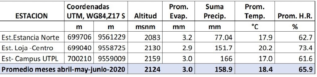 Analizando los resultados de las tres estaciones que en altitud no difieren mucho y en distancia horizontal están entre 1.2 a 2.7 km entre ellas, por lo cual es adecuado hacer un análisis comparativo entre las mismas. Del cuadro 1, se determina una similitud de los promedios de evaporación, caso similar en la precipitación de las estaciones de Loja-Centro y Campus UTPL, esto en razón de que el período de registro de datos son iguales, no así para el caso de la Estancia Norte, que hace falta el registro de información de la primera quincena del mes de abril. La temperatura es similar, difiere un poco la humedad relativa de la estación del centro, por lo que a los valores que registre dicho dispositivo se recomienda multiplicar por un factor de ajuste de 0.85 para obtener los datos reales.