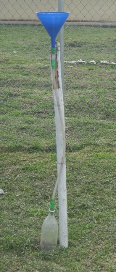 El pluviómetro artesanal consiste en un embudo de plástico de aproximadamente 16 cm de diámetro; dos metros de manguera transparente de 16 mm; un soporte que puede ser metálico o de madera resistente de una altura libre de 1.5 m; una botella de cola de 2 litros. La manguera debe acoplarse adecuadamente tanto al embudo como a la botella, de tal forma que no permita que haya fuga de agua en su ingreso y se reduzca al mínimo la evaporación del agua captada a través de embudo. El registro del volumen captado debe hacerse a la misma hora que se hace la lectura en el tanque evaporímetro y luego hacer la transformación del volumen a lámina de lluvia, en función al área de captación de la lluvia que corresponde al área del embudo.